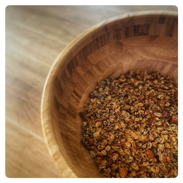 Meng alle ingrediënten goed door elkaar. Verspreid op een met bakpapier beklede bakplaat.